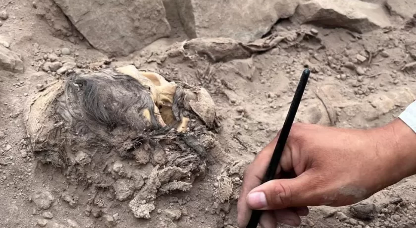 Students from San Marcos University, who are helping with the dig, first spotted the mummy’s hair and skull.